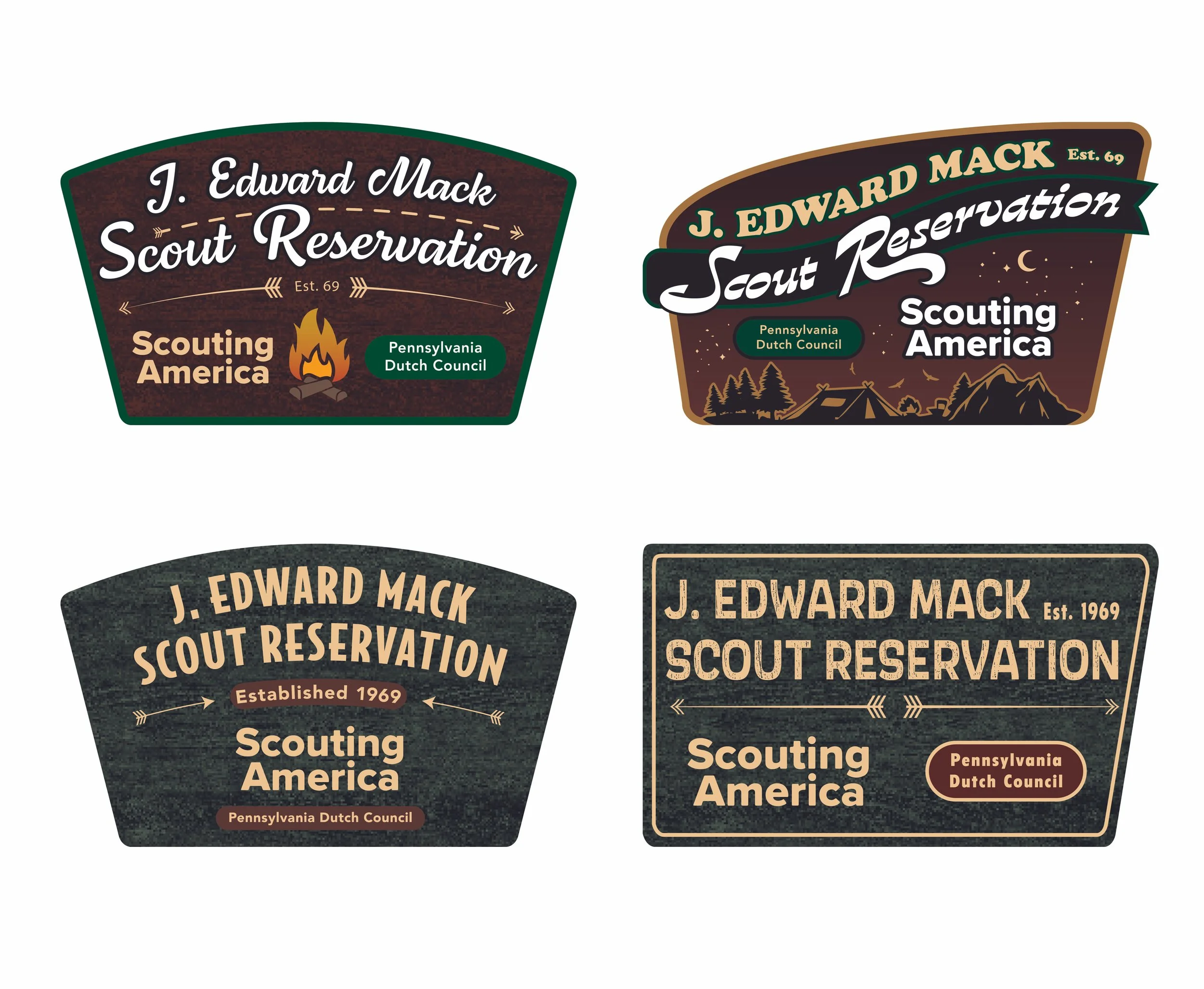 This was my first professional project at Stoner Graphix and the first monument sign I designed. This allowed me to see how bold I could go and how far I could push the design. The monument sign would be using an existing stone structure as the base and I was able to make the sign 10’W x 6’H. I knew that I did not want to make something boring and just keep everything contained in a rectangle and I chose to give the structure a fairly unique shape. I gave everything a woodland aesthetic with natural colors of green and brown, stone and wood textures, and expressive typefaces that felt friendly but fitting for the camp.